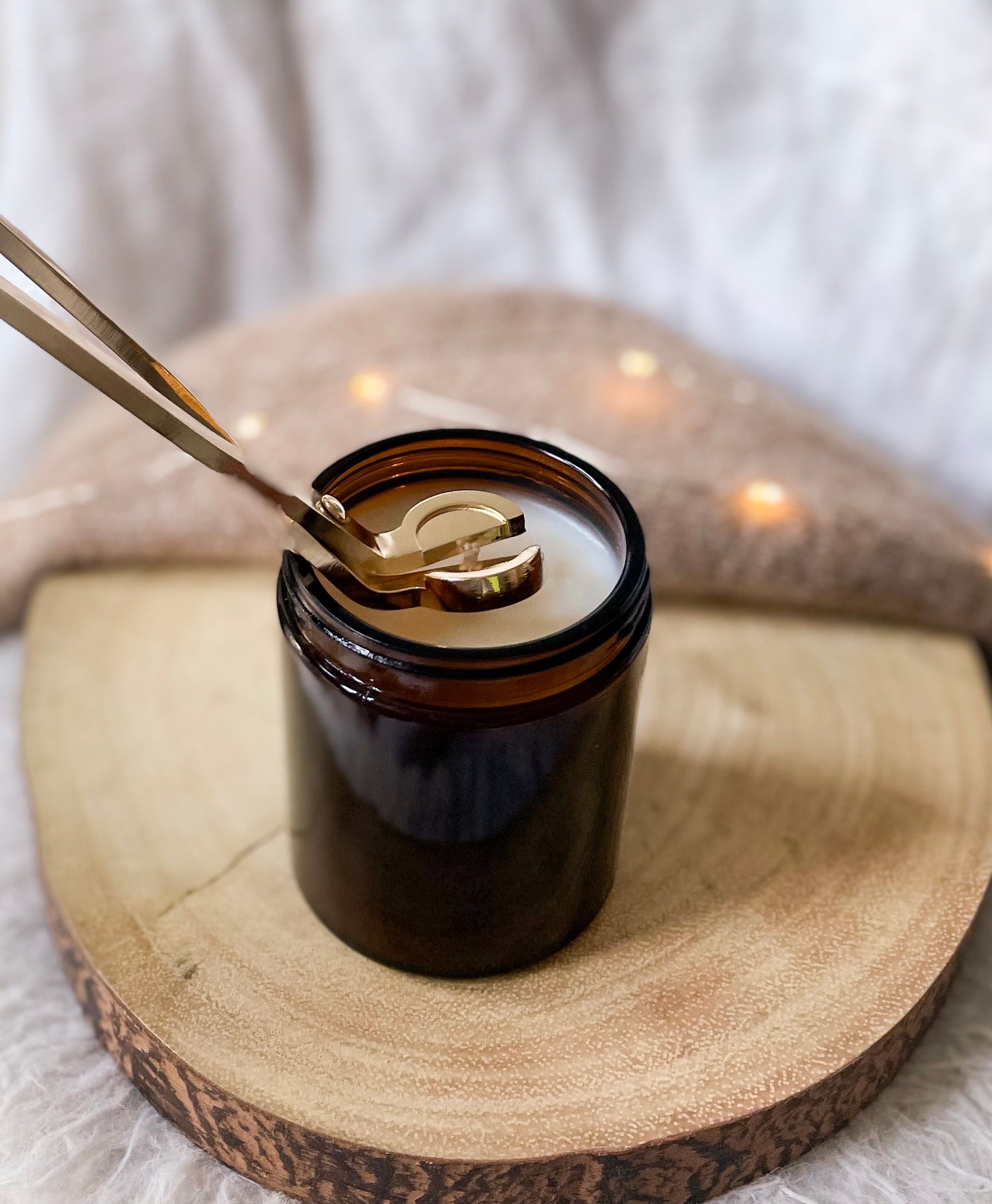 Instead of blowing out your candle use a wick snuffer to extinguish the flame. As well as feeling extra bougie when you do this it actually minimises smoke blowing about the room, stops soot blowing on the jar and means you won’t blow hot wax anywhere and make a mess.